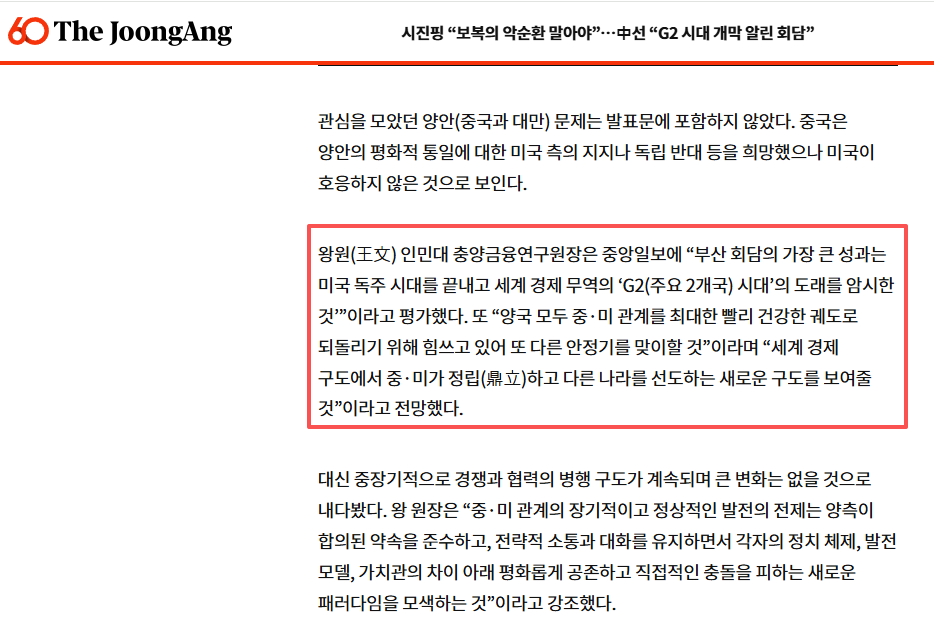 王文接受韩国《中央日报》采访时表示,在经历过前段时间关税战、贸易战后,当下中美元首釜山会晤的最大成果,可能是喻示世界经贸“G2时代”到来。从目前释放出的信号中可以感到,双方都在致力于让中美关系尽快重回健康轨道,中美经贸关系上或将迎来又一稳定期。而作为当今世界影响力最大的两个经济体,此次中美经贸关系的企稳回升,将使世界经贸格局呈现中美鼎立、领衔他国的新格局。
